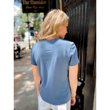 Embracing timeless effortlessness with the Unity top in vintage indigo, featuring a crew neck and short sleeves in a classic fit, crafted from 100% cotton for unparalleled comfort and breathability.
