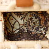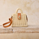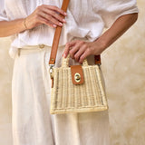 Gabriela features a rattan cane weave with a genuine leather detachable crossbody strap and silk printed lining.