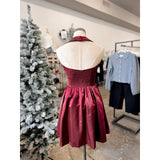 Turn heads this holiday season in the Eve Mini: features a halter neckline & a satin sheen finish with a flattering drop waist.