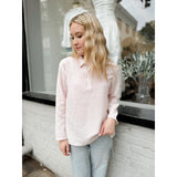 Rylan features a lightweight linen-like fabric and a henley collared neckline for an effortless transition top.