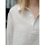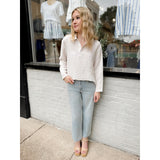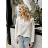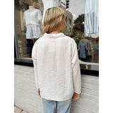 Rylan features a lightweight linen-like fabric and a henley collared neckline for an effortless transition top.