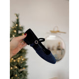 A chic ballet flat featuring stunning navy velvet with a crystal buckle strap detail for the perfect finishing touch to any holiday look.