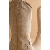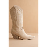 Sahara features a soft suede finish, tonal embroidery, and a point toe with a stacked angled heel.