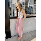 Elisa features a knit striped bodice with a poplin midi skirt for an easy + elevated go-to look.