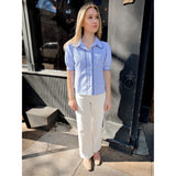 Features pinstriped detail with contrast scallop edge embroidery - just add white denim!